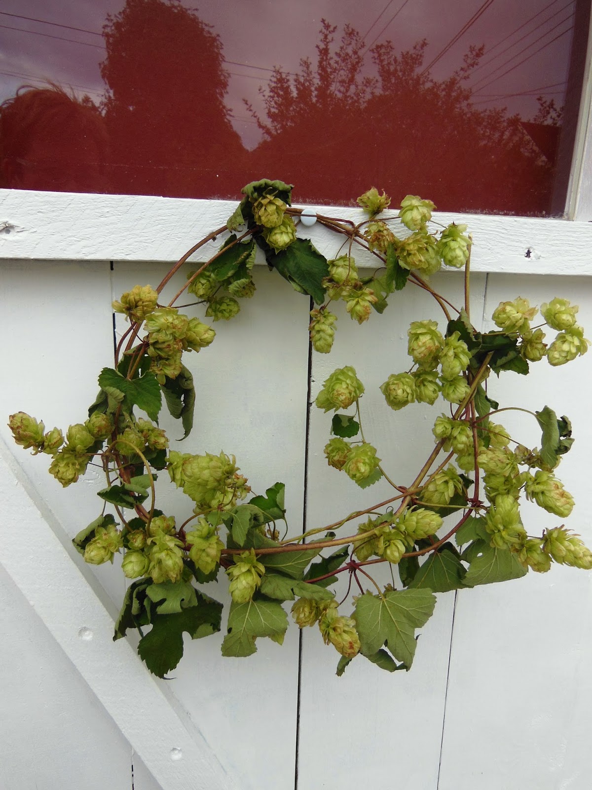 Humle er lett å lage kranser av, de er bare å tvinne rundt seg selv, de festes også ved å stikke endene sånn litt innimellom, superenkelt og dekorativt!